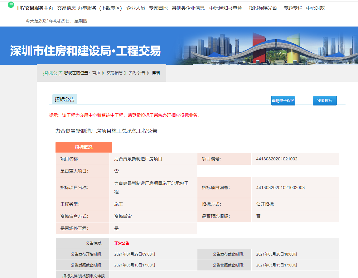 力合良景新制造厂房施工总承包工程招标在深圳市公共资源交易中心进行公开招标,有投标意愿者,请于 2021 年4月 29 日起在深圳公共资源交易中心网站 https://www.szjsjy.com.cn:8001/jyw/jyw/zbGongGao_View.do?ggguid=2c9e8ac278b115ad01791638730d5d4b 下载数据电文形式的招标文件。