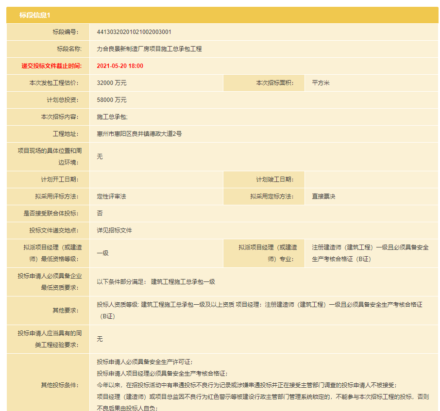 力合良景新制造厂房施工总承包工程招标集团内外网发布公告内容